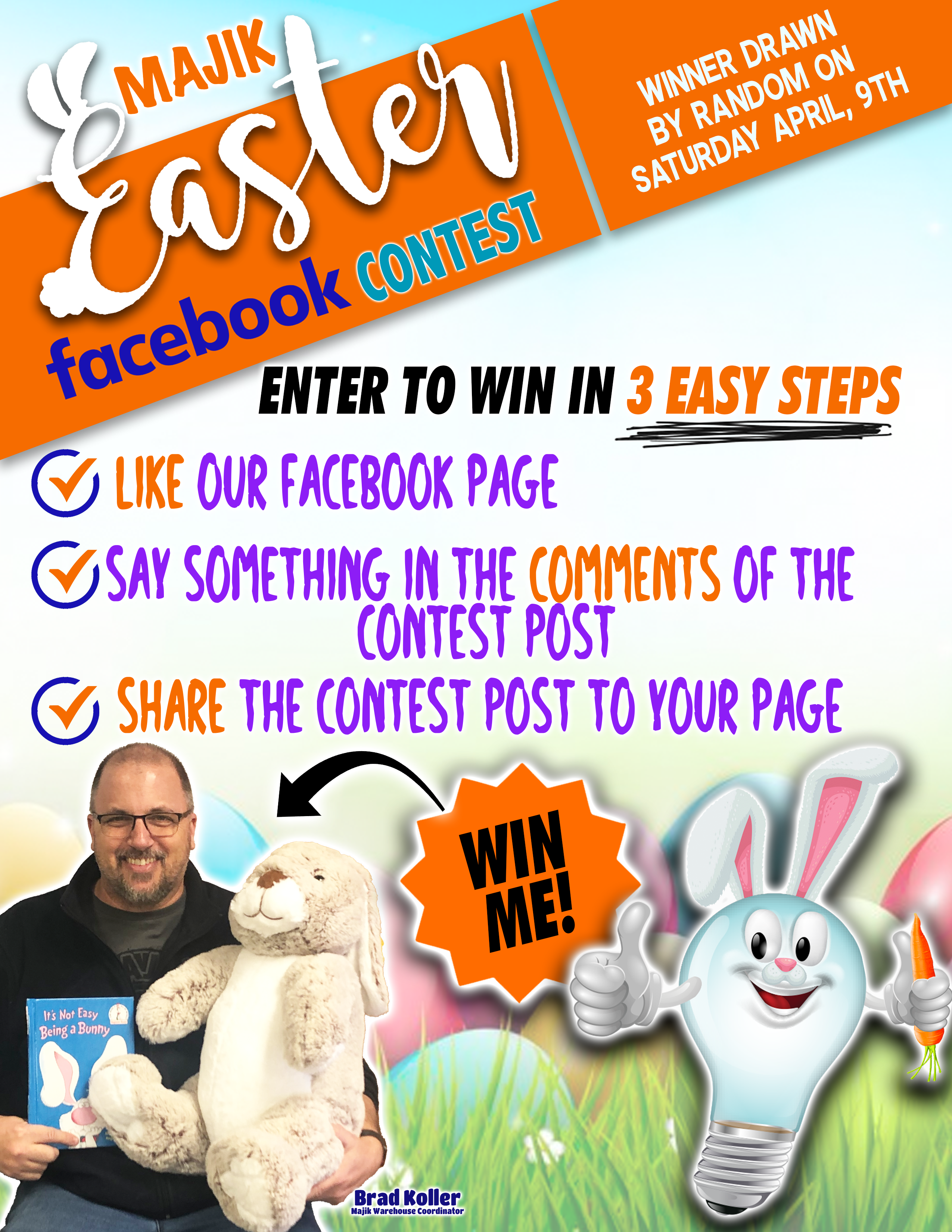 To celebrate Easter this year, Majik is running a Facebook contest to give away a soft, fluffy, cuddly, plush, stuffed bunny rabbit and his Easter book! This happy hair will be sure to bring a smile to your loved ones face or simply complement your already existing Easter décor. You can enter to win the contest up until Saturday April, 9th when a winner will be chosen by random. “Why are you ending the contest a week before Easter” you may ask. This will allow us to deliver the prized rabbit to the nearest store of the winter so they can have it on time for Easter! So don’t delay and enter to win now. You can enter to win this fluffy fella and his book by just following these three simple steps: