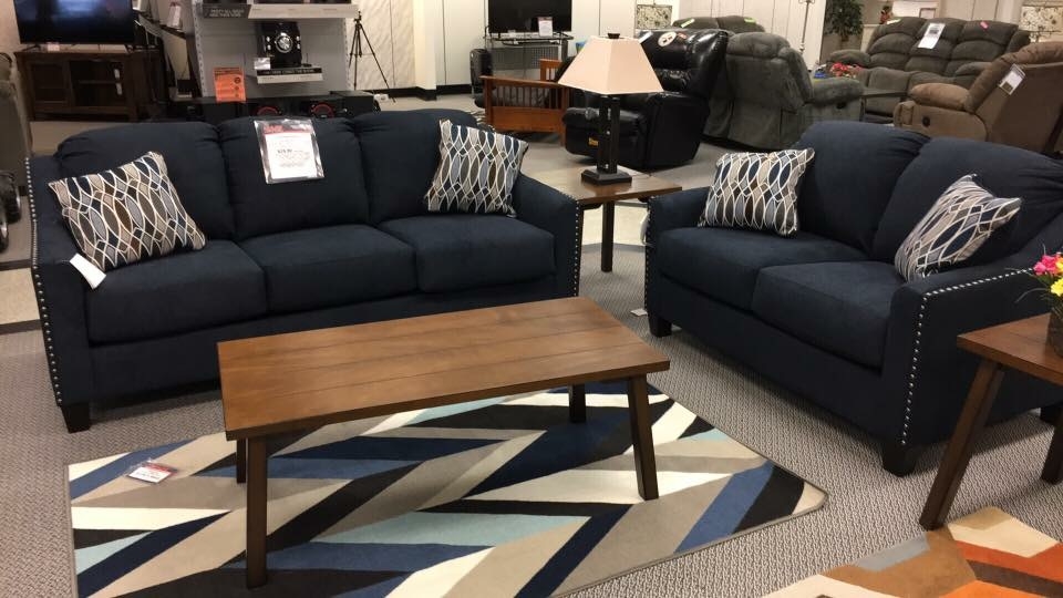 This set features striking midnight blue fabric that has a soft brushed feel. The sloping arms of the sofa and loveseat are outlined with brushed nickel-tone nailheads. Plush seating is accompanied by glass-work inspired patterned pillows. Both the sofa and loveseat come with two throw pillows. Shop this set here: http://www.gomajik.com/creeal-heights-sofa-and-loveseat-1671. It also has a matching accent chair seen here: http://www.gomajik.com/creeal-heights-navy-accent-chair-1734.