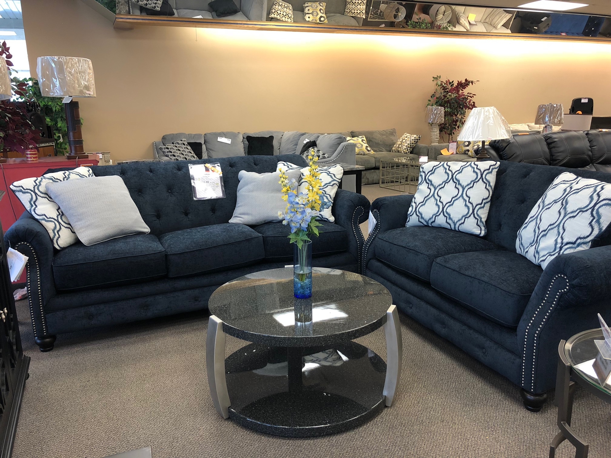 This sophisticated set is elevated with velvety soft chenille upholstery in navy blue and has button tufting on the back of both the sofa and loveseat. The nailheads are seen in a nickel tone and accentuate the pleated roll arms. The sofa includes four soft throw pillows and the loveseat includes two patterned throw pillows. Shop this set here: http://www.gomajik.com/lavernia-sofa-and-loveseat-4465.