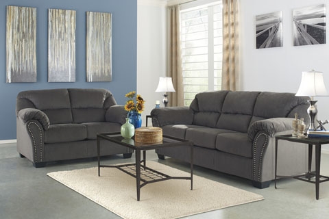 This plush set has a beautiful charcoal fabric and the nailheads line the rolled arms on the set. The silver-toned nailheads add that extra glam feel to this modern set. Shop this here: http://www.gomajik.com/kinlock-charcoal-sofa-and-loveseat-4463.
