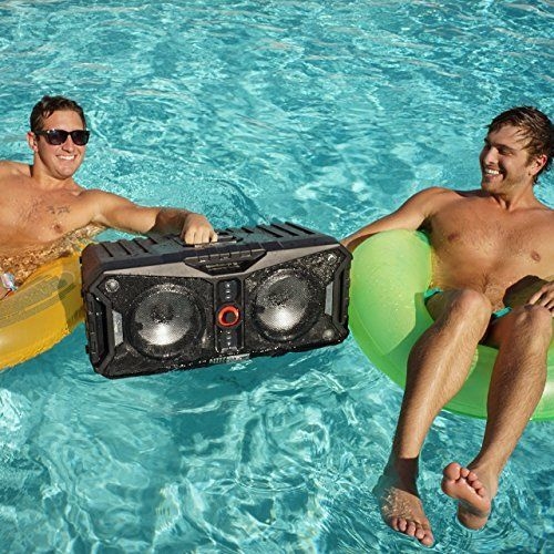 This is a larger version of the above. It has dual 8" woofers and three 1" tweeters to blast music to get any party started. This speaker is also dust proof and waterproof, so it will also float in water. It has the same LED light show of 12 color combinations and the strobe lights will dance along to your favorite songs.