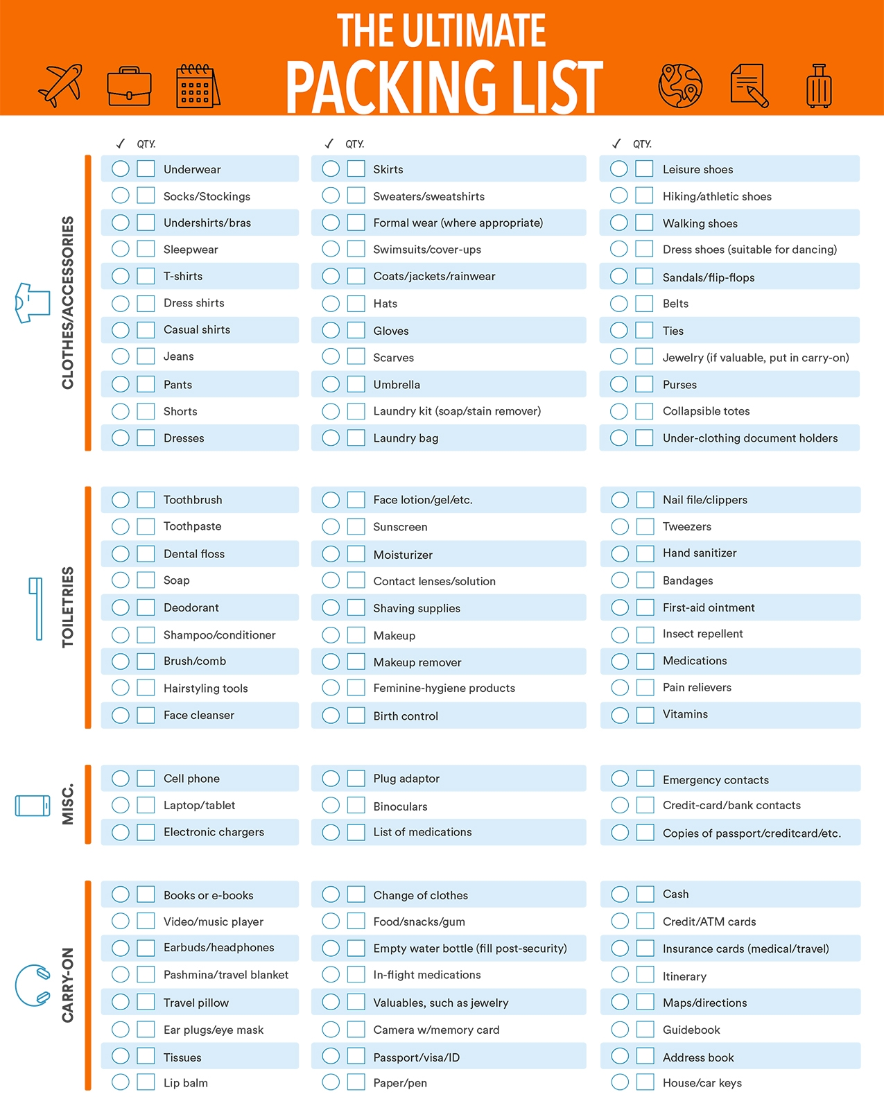 To see the ultimate packing list, scroll down the page and right click on the image to save and print out. To customize the list, simply download or print it, then edit for your specific needs. You can even use the packing list to help you decide what to separate out into a carry-on.