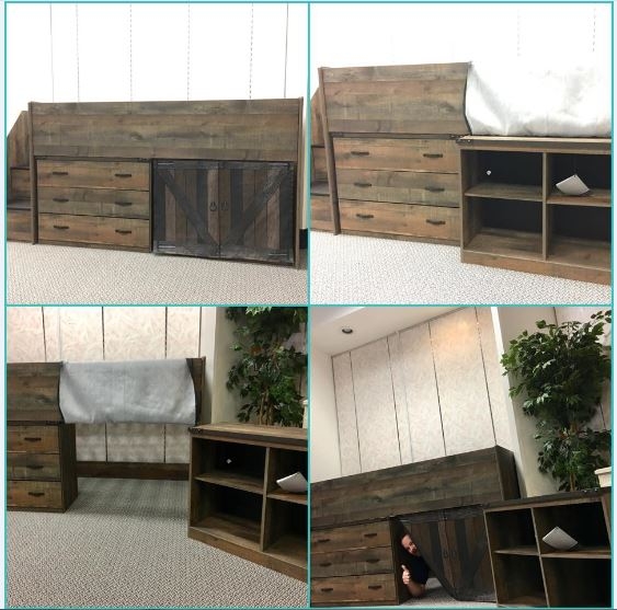 To create the fort, simply slide out the Loft Bookcase (or Loft Drawer Storage, depending on which side you place these items) and let the included curtain hang down. Now that's the ultimate playtime spot! Or, instead of the Loft Drawer Storage and Loft Bookcase, you can have a Twin Bed that pulls out from under the Loft Bed. The possibilities are endless with this set! Seen below is our co-work Anthony Russler from our Huntingdon store showing how to achieve this secret playtime spot!