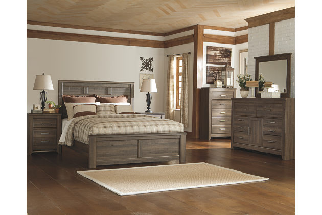 • Four-piece set: queen bed, dresser, mirror, and nightstand