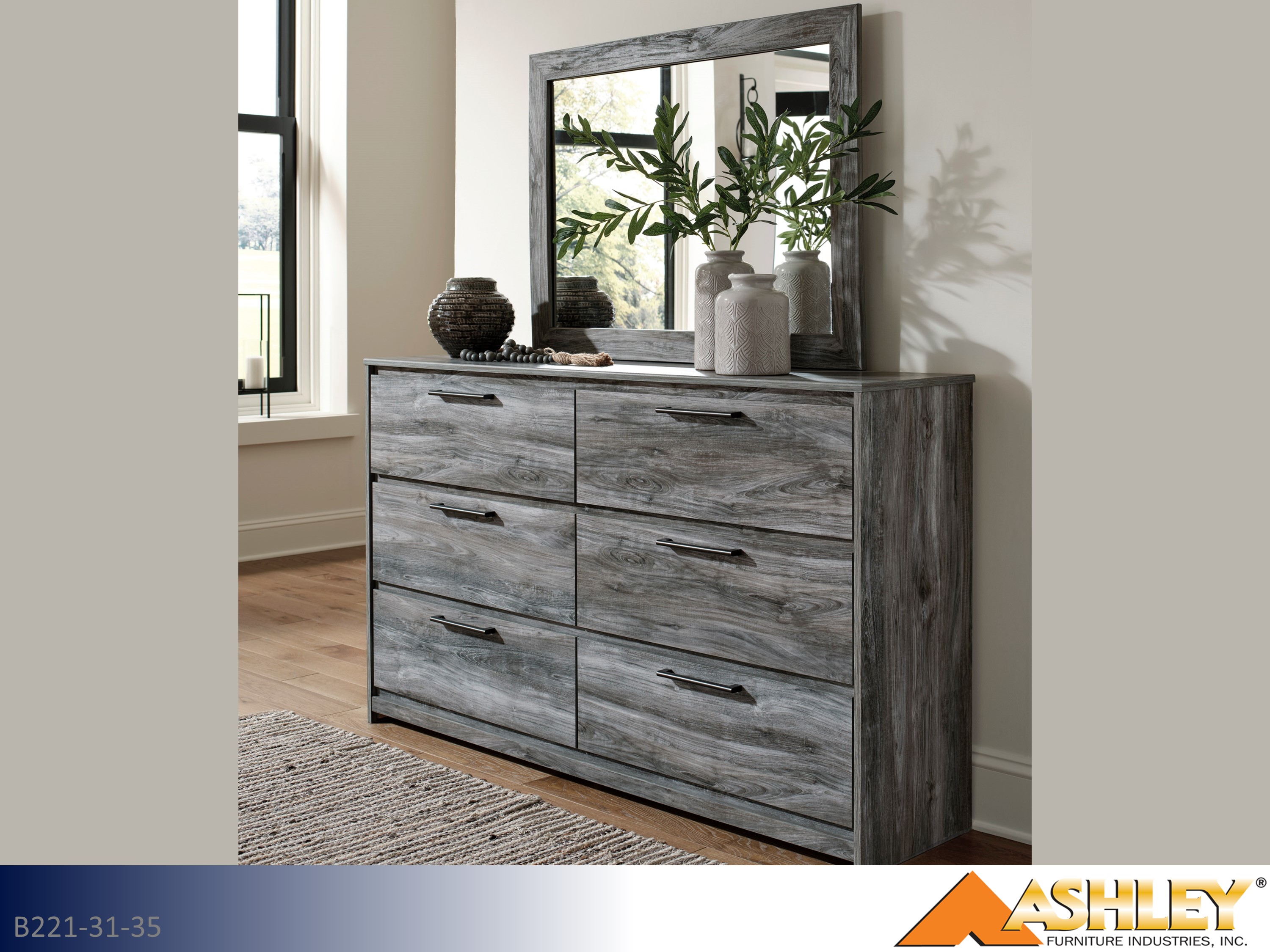 Sleek coastal style meets everyday practicality in the Ashley Baystorm Dresser & Mirror - Gray (2 Piece Set) [Model B221-31-35]. Designed with a smoky gray finish and replicated oak grain, this dresser and mirror combination brings modern charm and a relaxed feel to your bedroom. The dresser offers six smooth-gliding drawers for convenient storage, while the attached mirror adds depth, functionality, and a polished finishing touch to your room.