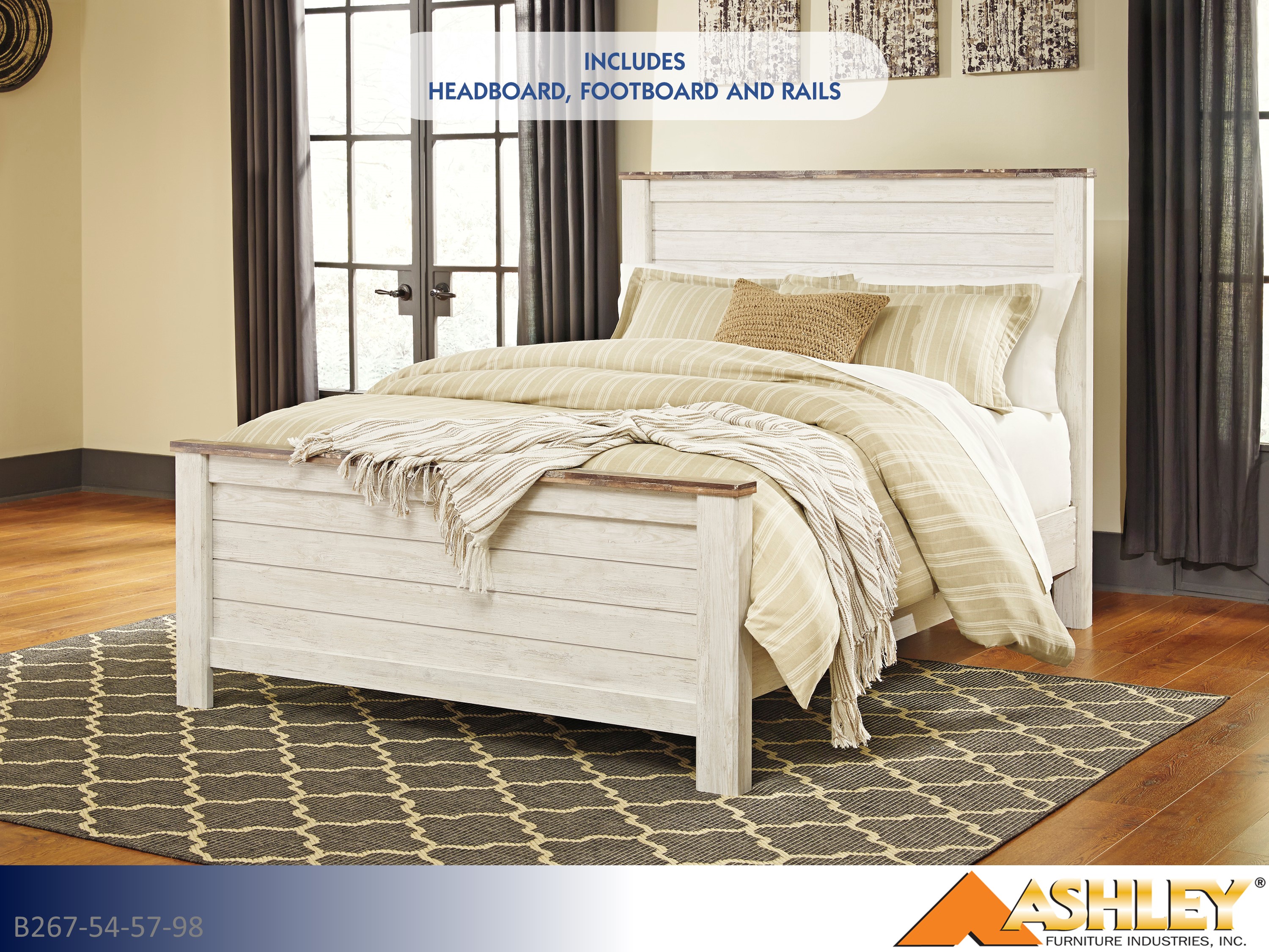 Crafted with durability and design in mind, the Ashley Willowton Full Bed offers a sturdy frame and a light, airy aesthetic that brightens any space. Its rustic yet refined appearance allows it to blend seamlessly with other furniture in the Willowton collection or to stand on its own as the centerpiece of your bedroom retreat.