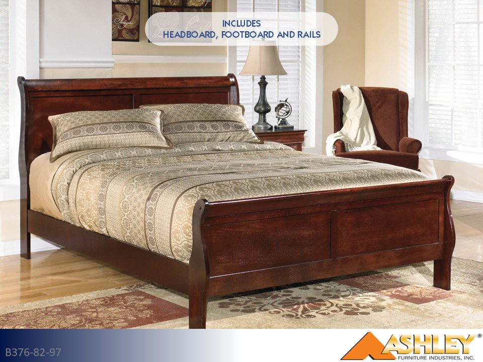 The Ashley Alisdair king sleigh bed sets a refined tone with its gracefully curved headboard and rich dark brown finish. A hallmark of classic bedroom design, its clean lines and subtle moldings invite calm, collected style.