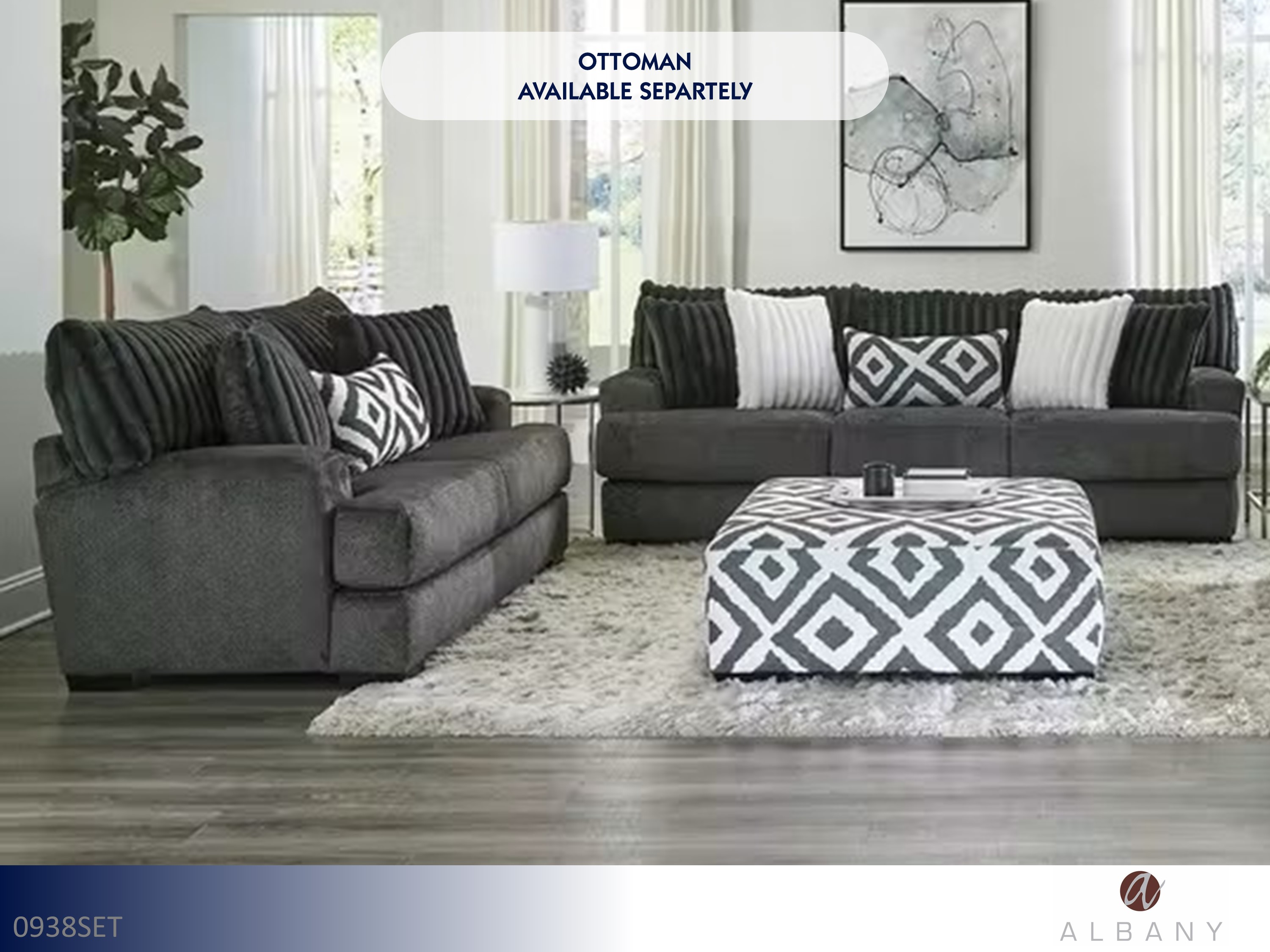Elevate your living room with the Jackson Varner Sofa and Loveseat - Ebony (2 Piece Set) [Model JAC205203NS/JAC205202NL]. Dressed in rich ebony chenille, this coordinated duo blends modern lines with deep, lounge-worthy comfort. Wide track arms, plush cushions, and designer accent pillows deliver an upscale look that anchors contemporary, transitional, and urban spaces while inviting everyday relaxation.